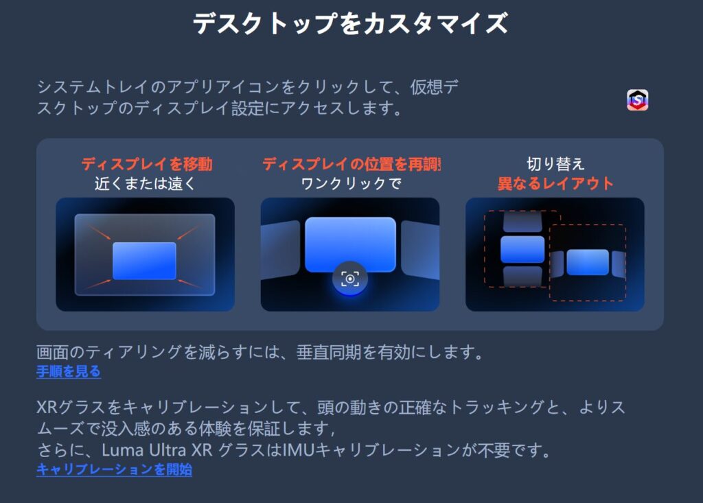 「SpaceWalker」無しで使う場合、Windows標準のマルチスクリーン機能で利用自体は出来ますが、このアプリを使う事で、3画面、パノラマ、首振りによる画面移動(3DoF)が利用可能になります。