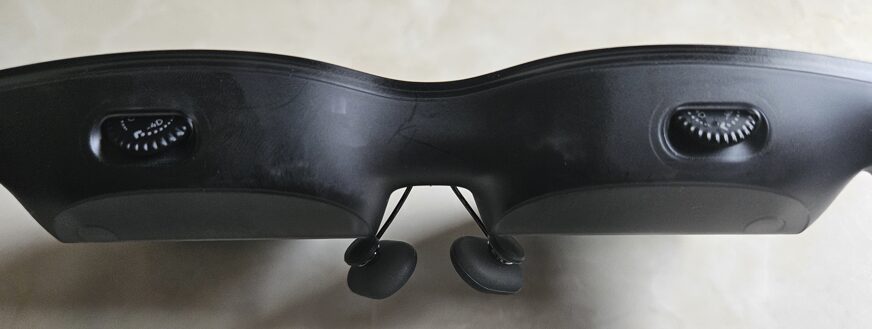 さらに、本体上部には「近視調整ダイヤル」がついているため、片目ずつピントを追い込めるのが本当に便利です。メガネを外して、素通しの状態で大画面を堪能できるのは、メガネユーザーにとってはこれ以上ない解放感だと思います。