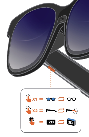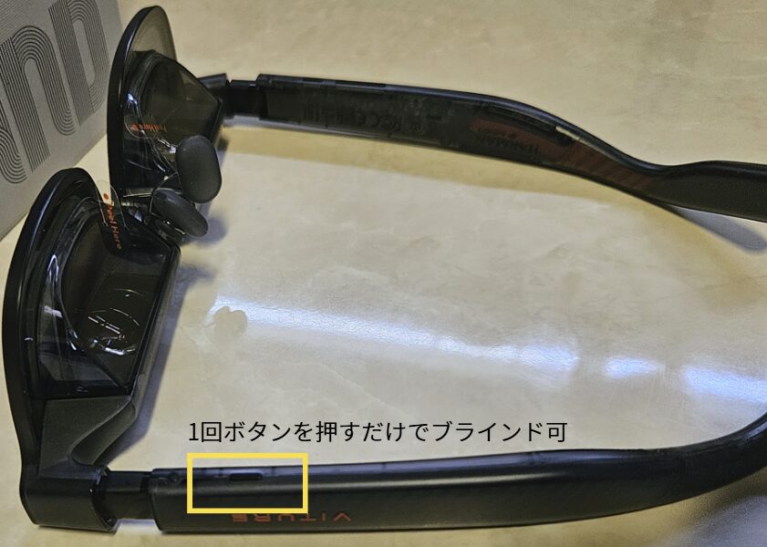 さらに、XREALは明るい場所で使う際に物理的な黒いカバーをカチャッと取り付ける手間がありますが、VITUREは物理ボタン1つで電子的にレンズを暗くできるため、すぐに映画や作業に没入できる手軽さで圧倒しています。3Dモードなどへの切り替えもボタン一つです。
